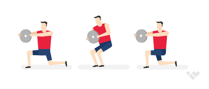 Hold the plate near the chest, push the plate as you go down and pull the plate closer when you’re back to the original position. Remember to maintain the reverse lunge position until the exercise is over. Staying low will provide tension and sync your upper and lower body.